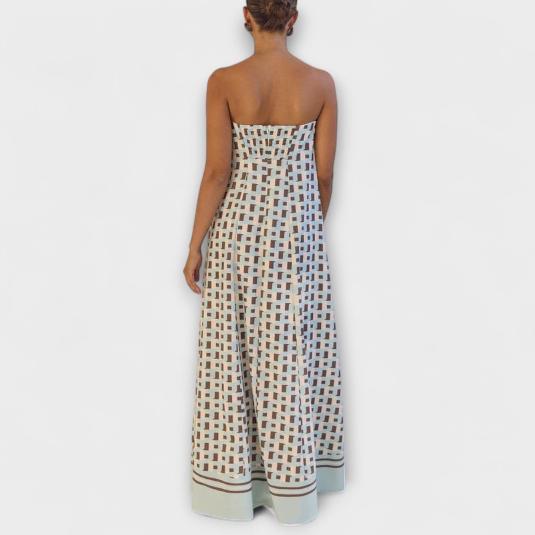 Odvážne, umelecké a bez námahy elegantné, tieto maxi šaty s odhalenými ramenami majú exkluzívne geometrický potlač, ktorý pritiahne pohľady. ideálna na každú príležitosť, od letných večierkov po štýlové denné výlety, sú tieto šaty vašim obľúbeným kúskom pre náročnú eleganciu.