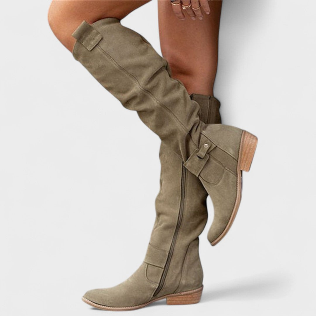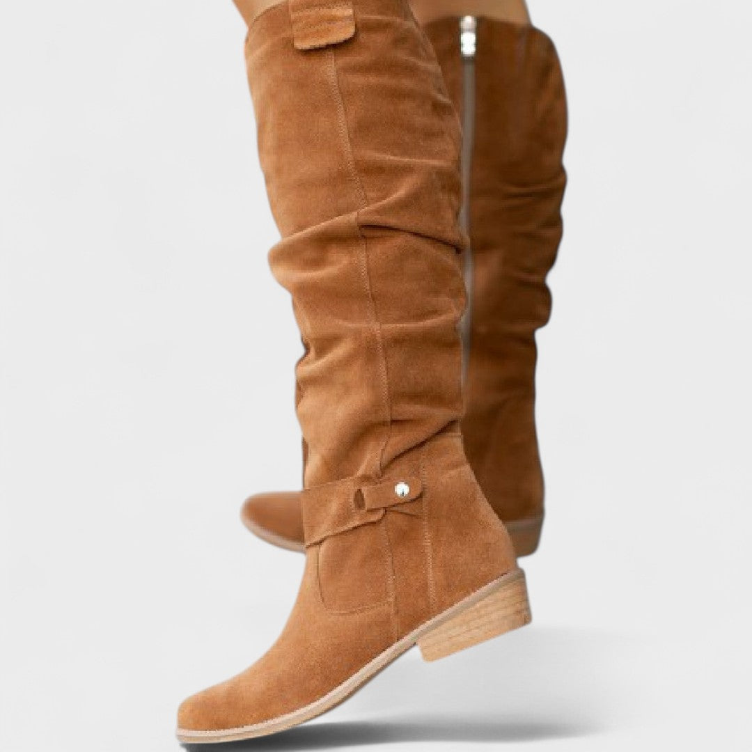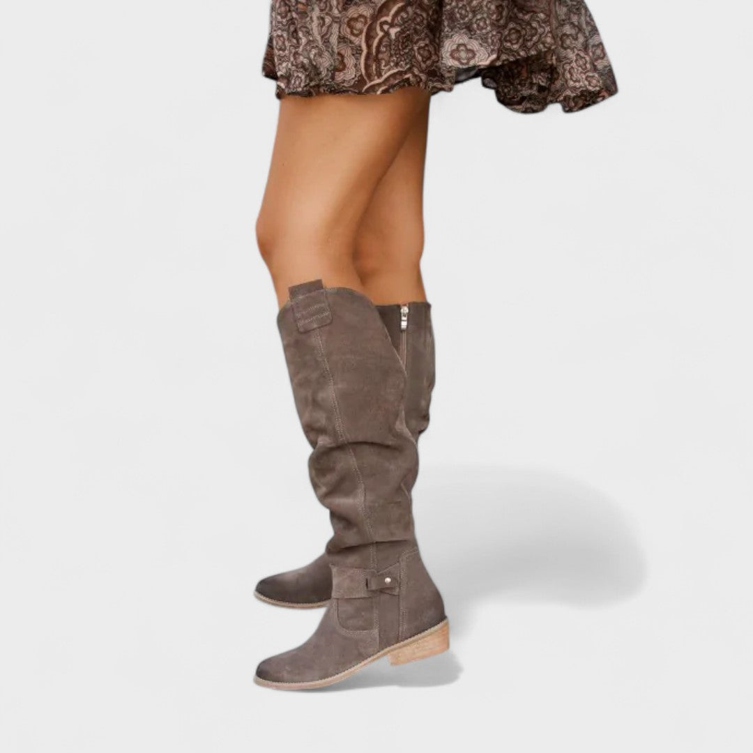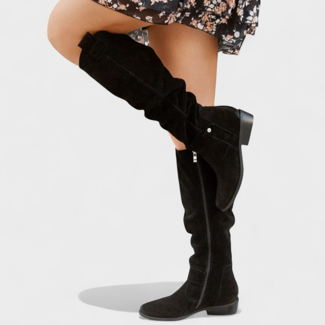 Tieto vysoké čižmy prinášajú mestský šik a pohodlie v jednom kroku. Mäkký, ľahký zvršok s elegantným nariasením sa prispôsobí nohe a ponúka uvoľnený, sofistikovaný vzhľad. Bočný zips umožňuje rýchle obúvanie, zatiaľ čo nízky blokový podpätok poskytuje stabilitu na celodenné nosenie. Jemné detaily ako dekoratívna pracka dodávajú nádych elegancie, ktorý sa ľahko kombinuje so šatami, sukňami alebo džínsami. Perfektné do práce, na kávu v meste aj na večerné vychádzky.